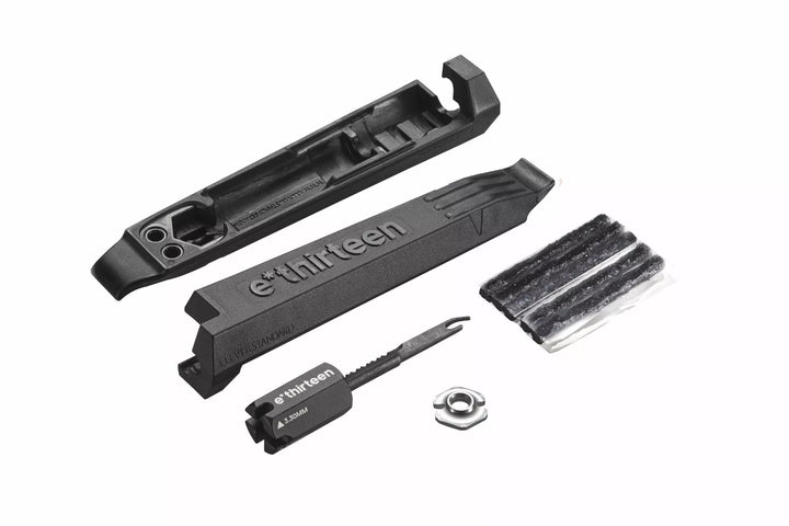 Take the frustration out of flat tires with e*thirteen's tire liver and plug repair kit., This handy and compact tool is a combination of 2 sturdy composite tire livers which encase a tire plug needle and 5x3.5mm self-adhesive. Theyre some of the toughest livers on the market, designed for dh casing tire use, act as a Comfortable handle for the tire plug needle, making insertion into the heaviest Case Tires a Breeze, and Include 4 sizes of spoke wrenches, for spokes Includes: 2 Composite Tire Liver's Designed for DH Case Tire Toughness + Puncture Plug Needle and 5 Extra Thick 3.5mm Self-Adhesive plugs +3.23, 3.30, 3.45, 3.96mm Spoke Wrenches