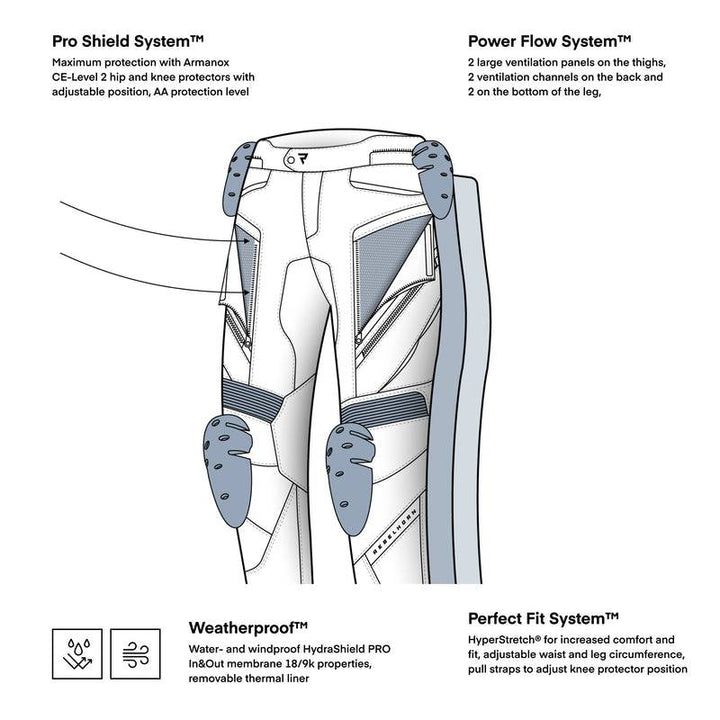 With two large ventilation panels on the thighs, rear air ducts and Openable lower leg panels you get full control over the air flow. Even the pockets on the thighs are smartly designed to serve as extra ventilation openings.