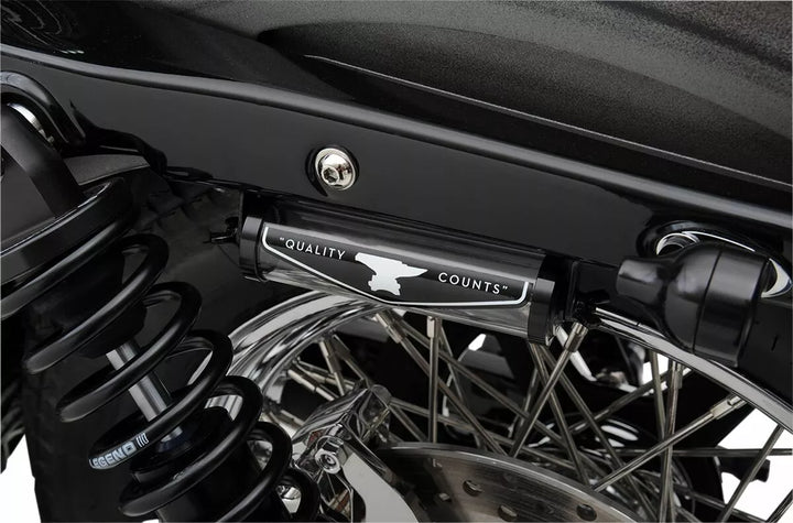 Fit 5.75 "na strednom skrutke/USA. Motocyklové poznávacie značky, zahŕňajú čierne elektroplované oceľové držiaky L a hardvér, CNC-machinované koncové uzávery v čiernom alebo leštenom hliníku, plastové plastové zastavenia rezistentné na nárazy 4,75" L x 1 "vnútorný priemer