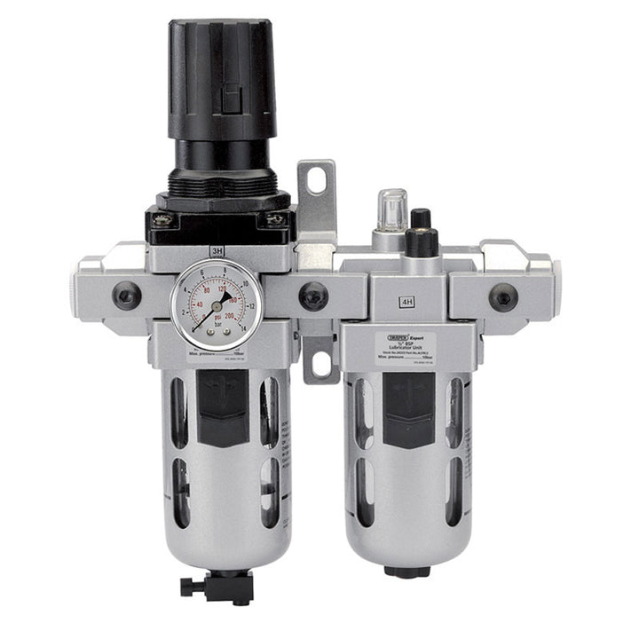 Vzduchová úpravová jednotka, odporúčaná pre kompresory> 200 L. Navrhnuté na reguláciu výstupného tlaku vzduchu, eliminovanie vlhkosti a kontaminantov z prietoku vzduchu a na mazanie nástrojov počas používania. Dodávané s upevňovaním steny a manometrom.
