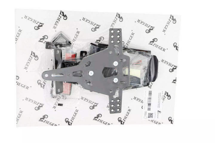 Držiak poznávacej značky je mimoriadne odolný a dôkaz o počasí, potiahnutý čiernym práškom. , Držiak poznávacej značky sa môže použiť na akýkoľvek druh poznávacej značky (šírka 175 mm). Nevyžaduje sa žiadna úprava kapotáže., Stepless nastavenie uhla raku. Doska., Špeciálne indikátorové ľahké držiaky (predávané osobitne) potrebné pre svetlá indikátora zásob., Kit obsahuje: 1 držiak ŠPZ s. Montážna súprava., LED ŠPZ LIGHT LIGHT „E primerané“ vrátane. Podpora., Zadné svetlo s podporou. OF: Nemecko, Slovinsko, Chorvátsko a Veľká Británia.