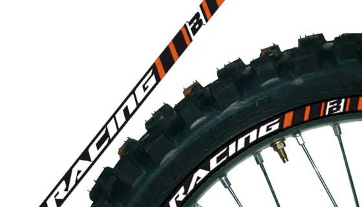 Sada sa skladá z 8 predných nálepiek rýmov a 8 zadných nálepiek s rýmami plus 2 náhradné diely. Umožňuje ozdobiť stranu ráfika lepiacimi pruhmi špecificky tvarovanými. Môže sa uplatniť na 17 '', 18 '', 19 '' a 21 '' 'Rims. V prípade Minicrossa musia byť nálepky na koncoch rezané, aby ich prispôsobili spodnému priemeru rýmov. Farba: oranžová