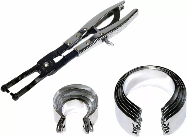 Kliešte na kliešte na kompresor aj kliešte na prsteň sú uvedené s račným zámkom, aby držali rukoväte v polohe pre ľahkú inštaláciu piest a prsteň, rukoväť Plier's Grip pracuje horizontálne aj vertikálne, pracuje s priemermi piestov 1-3/8 "-4-3/8"