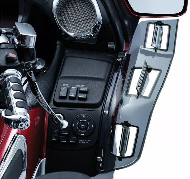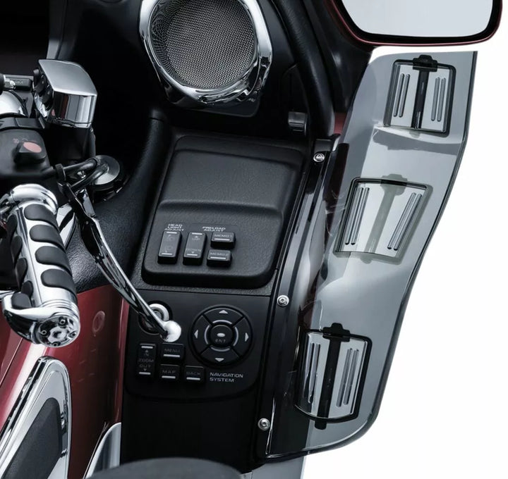 Poskytuje úplnú ochranu vetra pred zrkadlami až po boky kapotáže, prietok vzduchu je možné nasmerovať smerom k alebo od jazdca alebo spolujazdca s tromi nastaviteľnými deflektormi vetra na stranu, lakovaný mechanizmus, ktorý je na mieste, drží na svojom mieste; Ľahko upravené ručne, tmavé tónované pevne potiahnuté polykarbonátové konštrukcie, na tomto produkte nepoužívajte dažďové alebo iné výrobky na čistenie alebo ochranu na báze amoniaku.