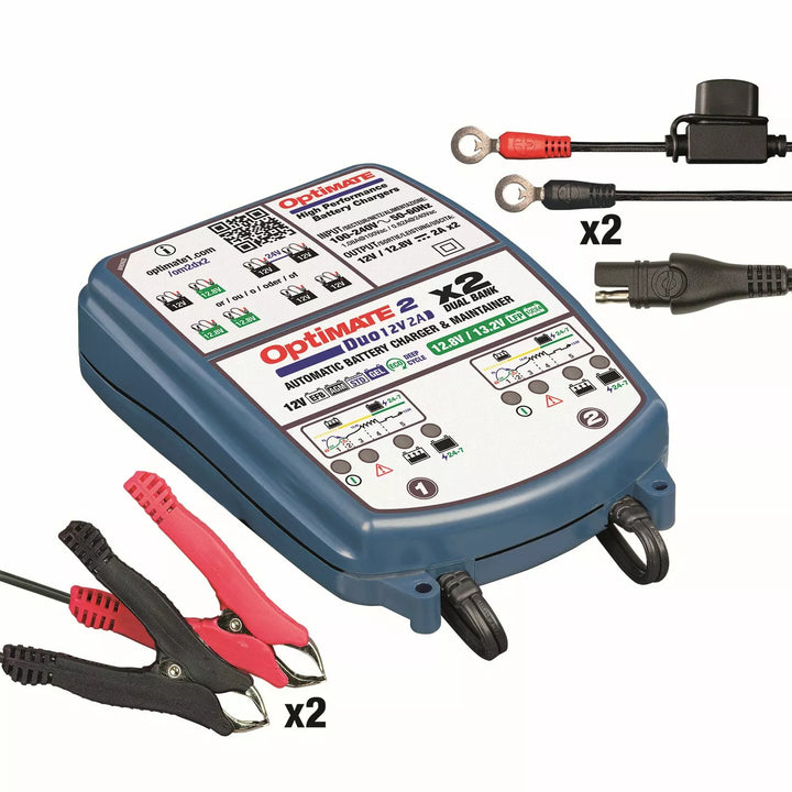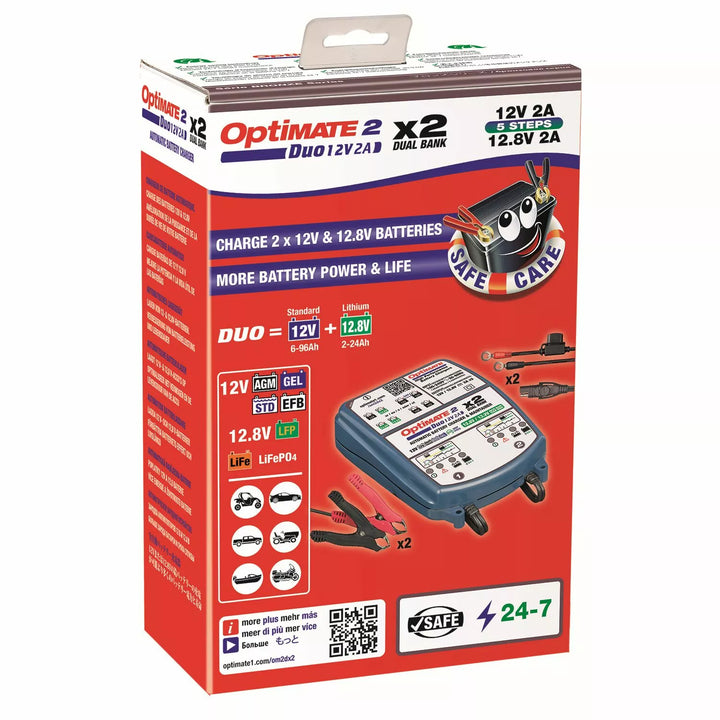 Opticate 2 Duo x 2 banka Bronzová séria: 5-krok 12V / 12,8 V 2A Utesnený údržbár batérií X2., Výkonný „no mozgový“ 2-bankový batériu pre batériu hi-tech v ktoromkoľvek z vašich vozidiel. Zaručuje zdravé lítium alebo olovo-kyselinová batéria!, Ideálne pre 2x 12V olovo a 12,8 V / 13,2 V lítium LFP (LIFEPO4), nezávisle nabíjanie, testovanie a udržiavanie batérií olovo 2 x 12 V (STD, GEL). Batérie sú vždy pripravené na vykonanie., Dodáva 2 ampéry nabíjaný prúd odporúčaný na údržbu väčších batérií., Poplatky a poskytuje dlhodobú údržbu. Pripojte sa k batérii a Duo Bank Optime 2 Duo Bank robí zvyšok, nevyžaduje sa žiadny dohľad!, Duo: Automaticky sa prispôsobuje batérii PB alebo LFP. Úplná elektronická ochrana., 24/7: Udržiava batériu pri plnom nabití a dobrom zdraví., Nízky voltový začiatok 4v. Pohotovosť menšia ako 0,5 W a účinná údržba batérie 24-7., IP54: odolný voči poveternostným vplyvom. Menené na použitie až do -40 ° C / -40 ° F.